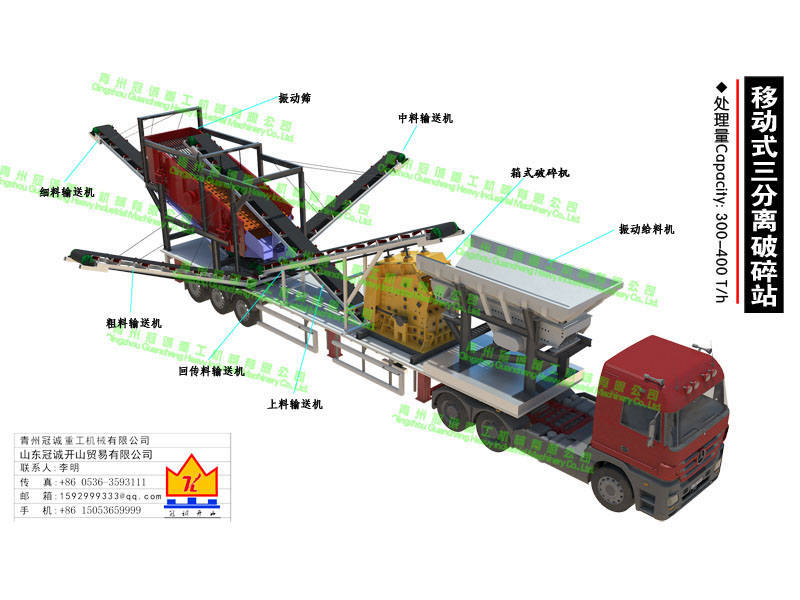 本套移動(dòng)破碎站為移動(dòng)式三次分離破碎制砂設(shè)備,處理量為每小時(shí)60-100立方,本移動(dòng)破碎制砂設(shè)備是青州冠誠(chéng)重工機(jī)械有限公司獨(dú)立設(shè)計(jì)制作而成,直接采用17.5米半掛車底盤改裝制作,基優(yōu)勢(shì)如下: